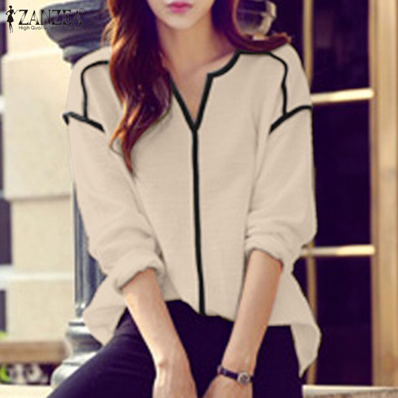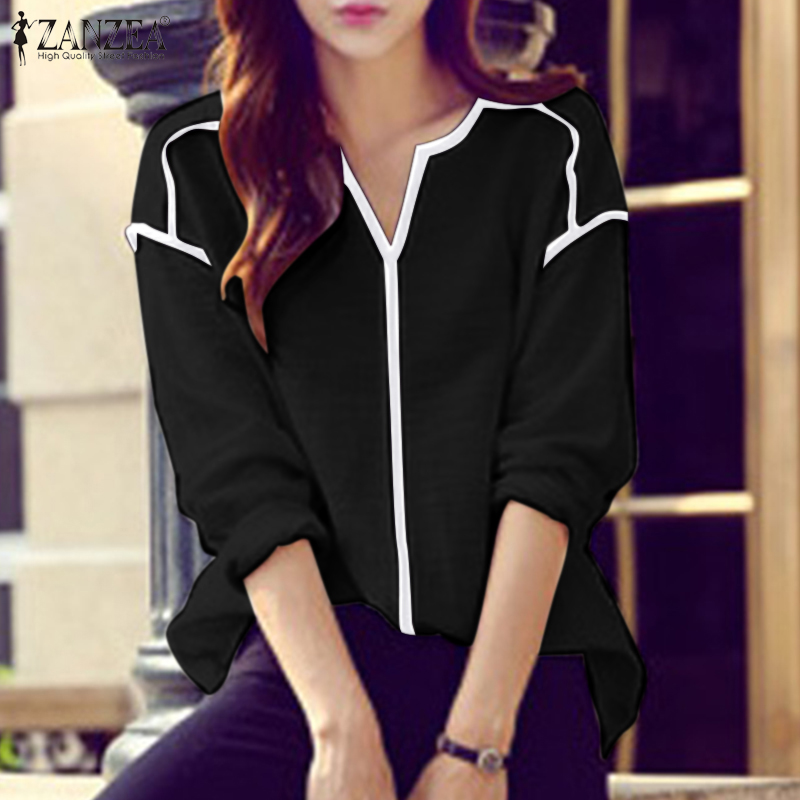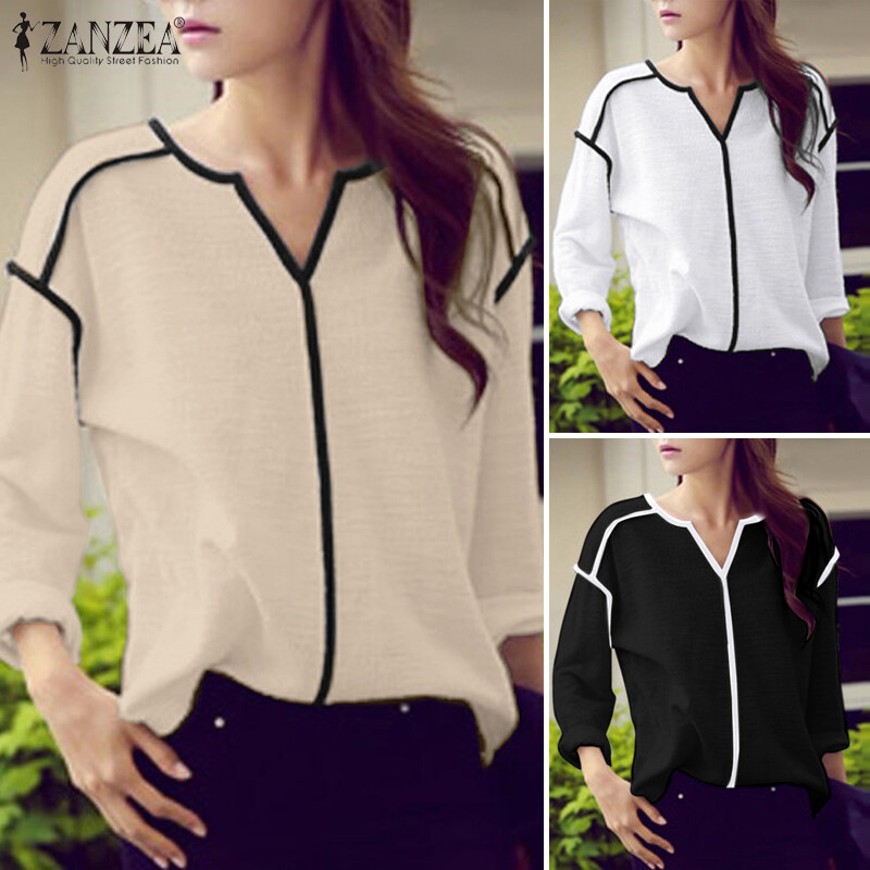 ZANZEA Womens Long Sleeve Contrast Color T Shirts Casual Baggy V Neck Jumper Tops Blouse