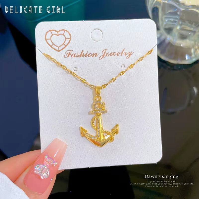 DIEYURO 316L Stainless Steel Golden Zircon Ship's Anchor Pendant Necklace For Women Trend Clavicle Chain Jewelry Holiday Gift