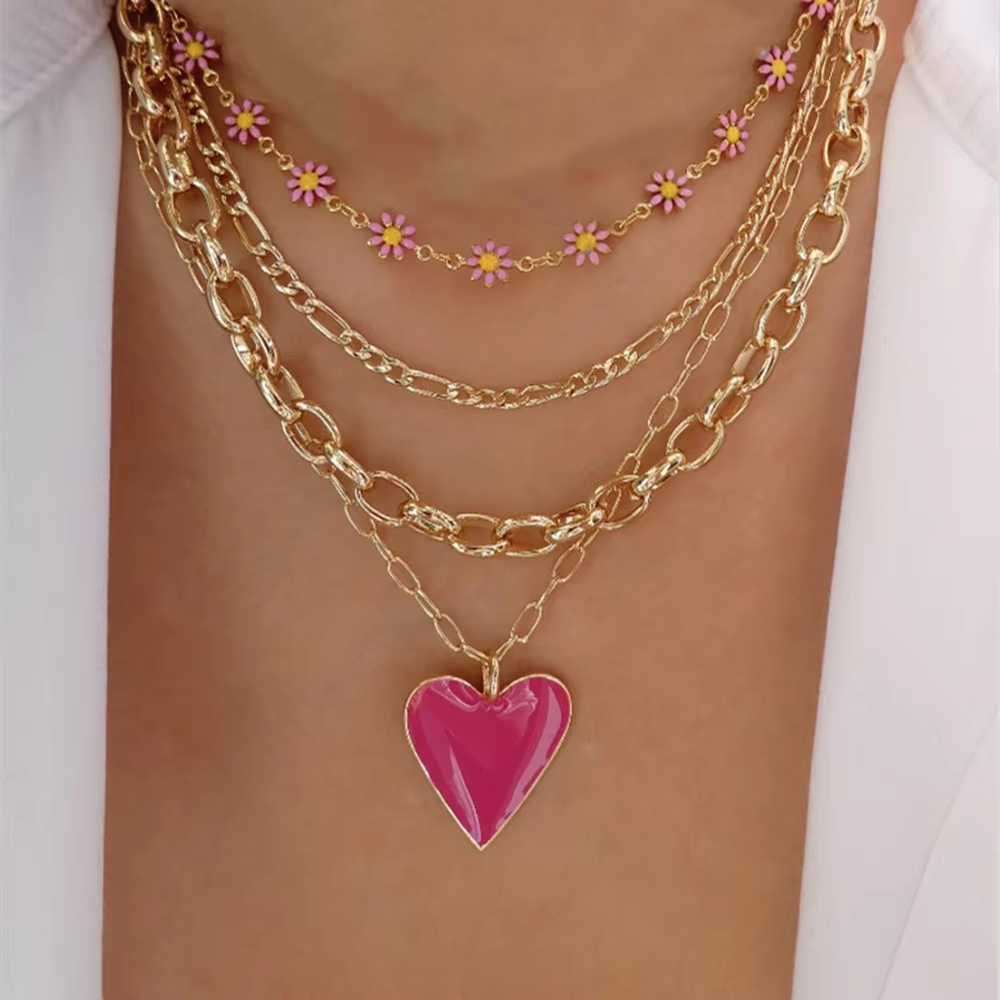 Vintage Gold-plate Punk Multi-level Flower Chain Drop Oil Red Heart Pendant Necklace For Women Girl Fashion Choker Trend Jewelry