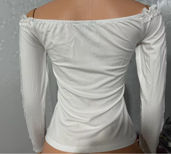 Style: Chic Type: Tee Material: 90%Polyamide,10%Elastane Neckline: Off the Shoulder Sleeve Style: Long Sleeve Length: Regular Pattern Type: Plain Decoration: Lace,Hollow-out Fit Type: Skinny Occasion: Daily Package Include: 1*Top Fabric Elasticity: Slight Stretch Sheer: No Care Instructions: Hand wash, do not dry clean
