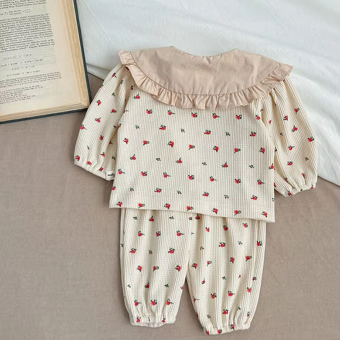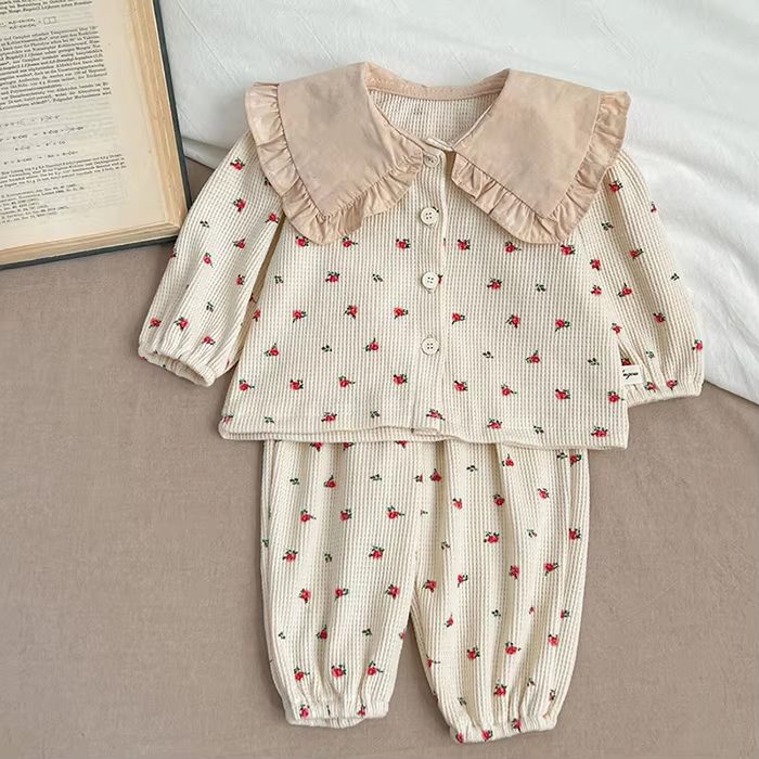 2024 New Spring Newborn Baby Girls Clothing Suit Long Sleeved Waffle Cotton Printing Cardigan+Pants Infant Baby Girl Clothes Set