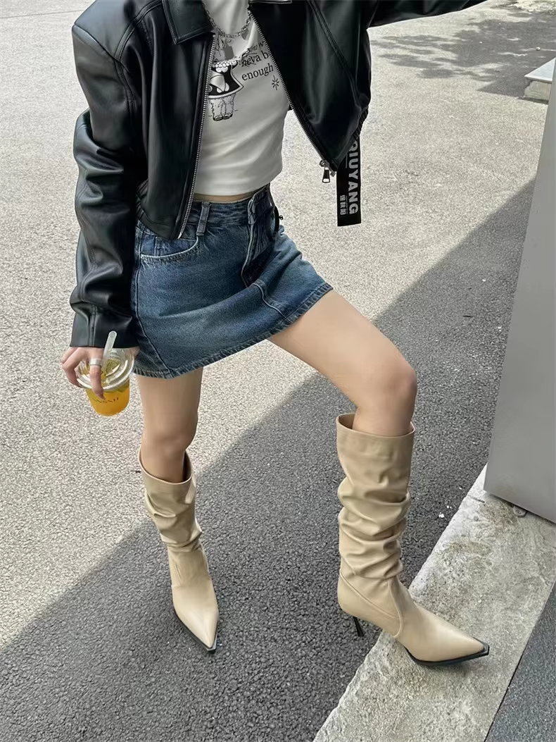 2024 Sharp Pointed Retro Fashion Women's Shoes Hot Sell Long Tube Pleated Women's Boots Look Slim Sexy Trendy High Heeled Boots