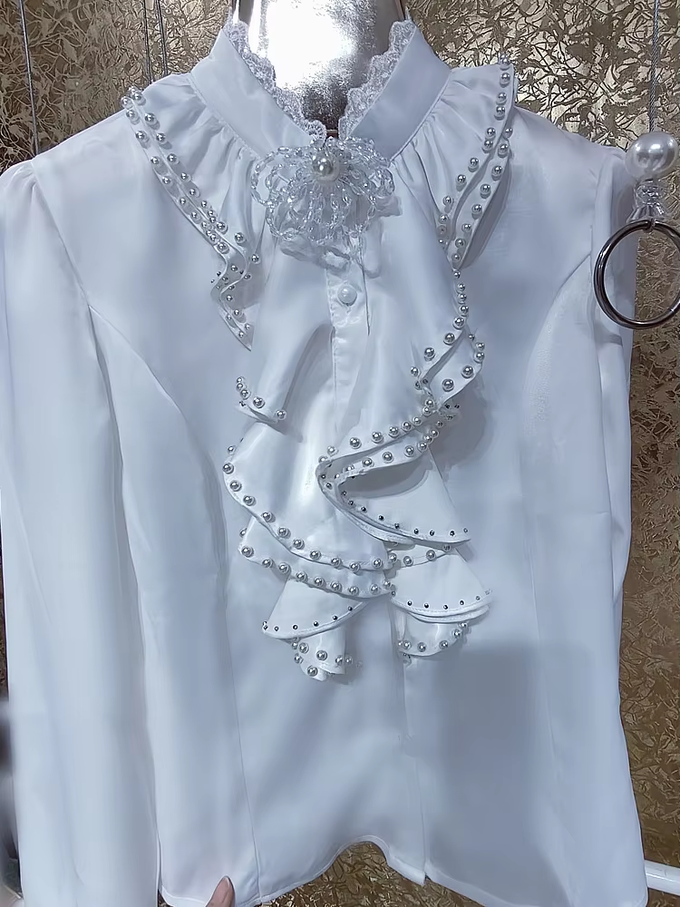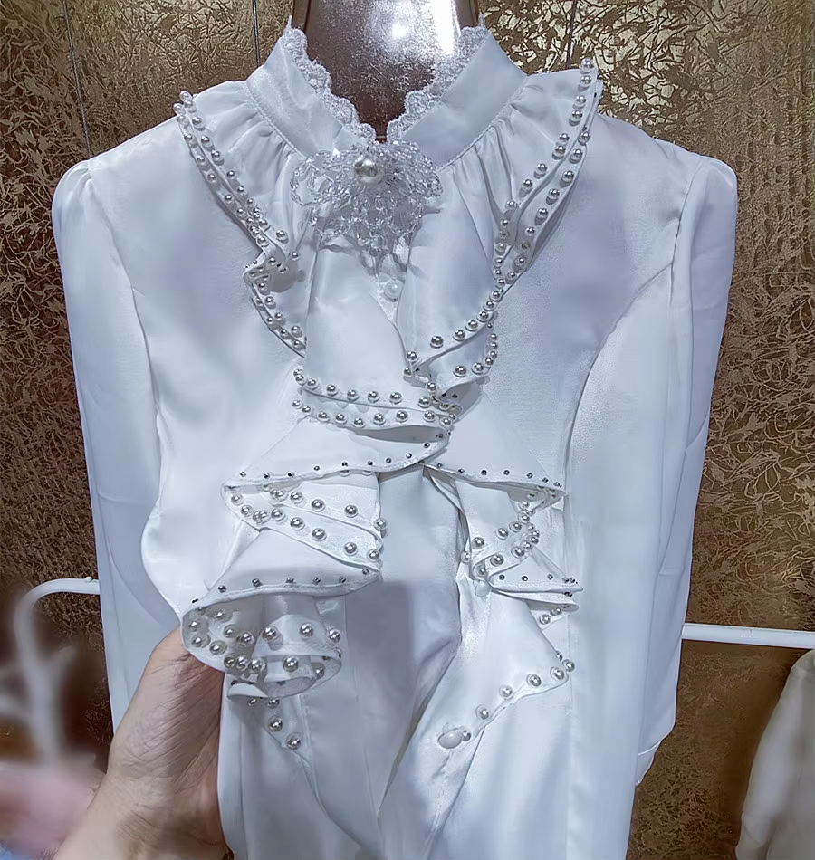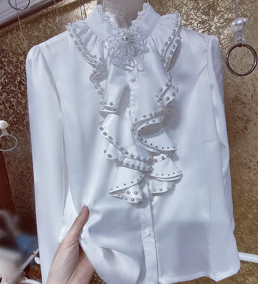 Camisas De Mujer Women Beaded Ruffles Shirts and Blouses For Women 2024 Spring Long Sleeve Single Breasted White Tops Blusas