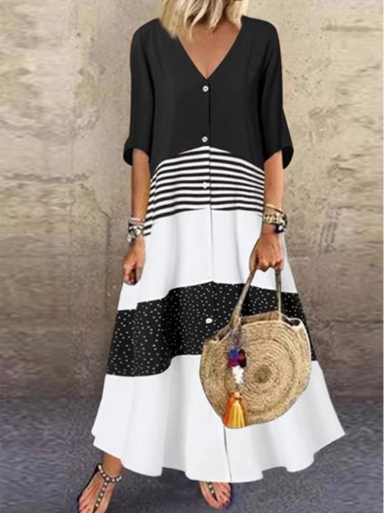 Color Blocked Printed Short Sleeved V-neck Button Up Women's Dress Street Versatile Artistic Retro Style Summer Dress