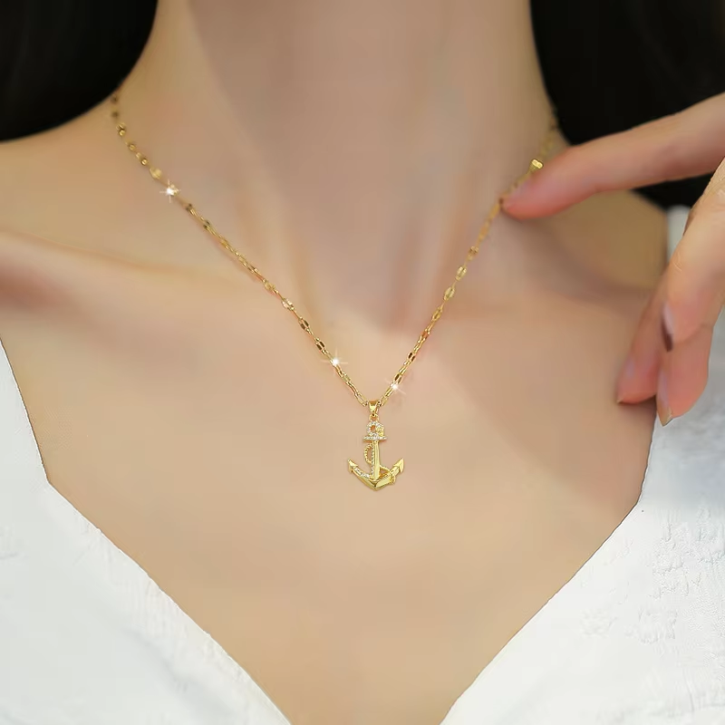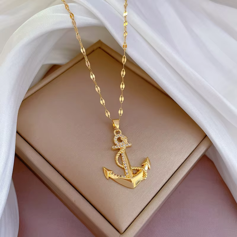 DIEYURO 316L Stainless Steel Golden Zircon Ship's Anchor Pendant Necklace For Women Trend Clavicle Chain Jewelry Holiday Gift