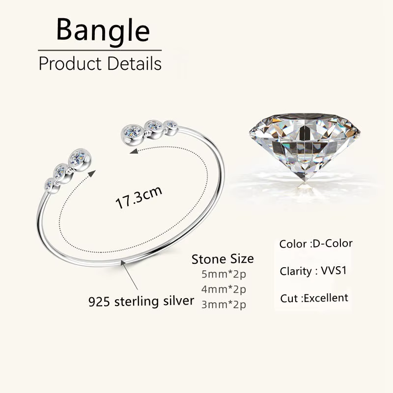 Lnngy Adjustable Cuff Bracelet Original and Pure 925 Sterling Silver Bezel Moissanite Bracelets For Women Opening Wrist Jewelry