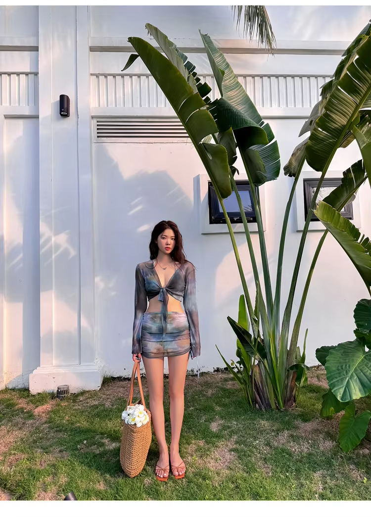 New Korea Style 4 Pieces Set Swimsuit Women Tie Dye Swimwear Sexy Triangle Bikini with Skirt Beach Wear Long Sleeve Bathing Suit