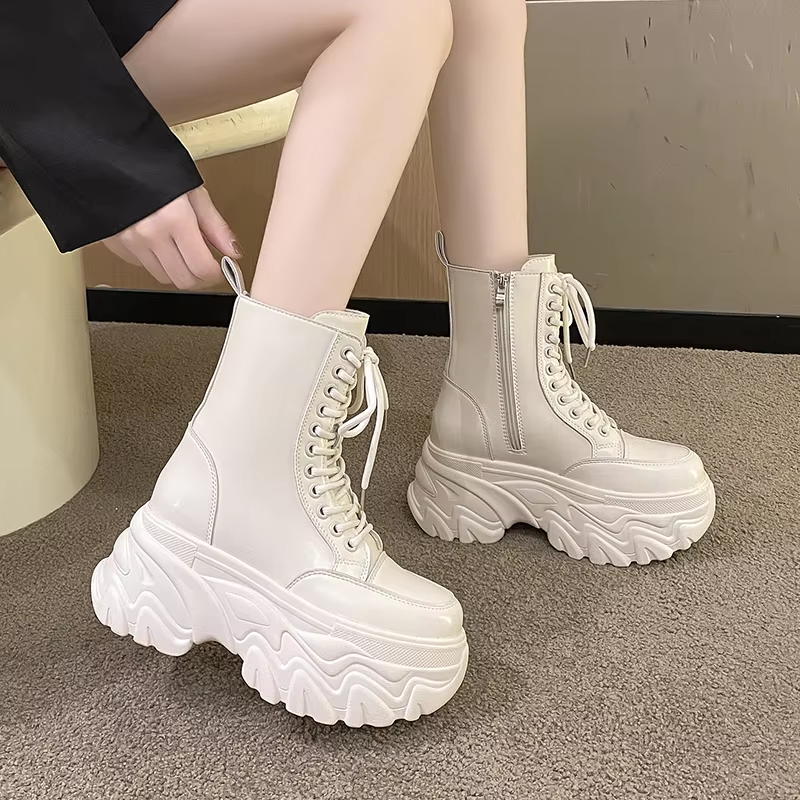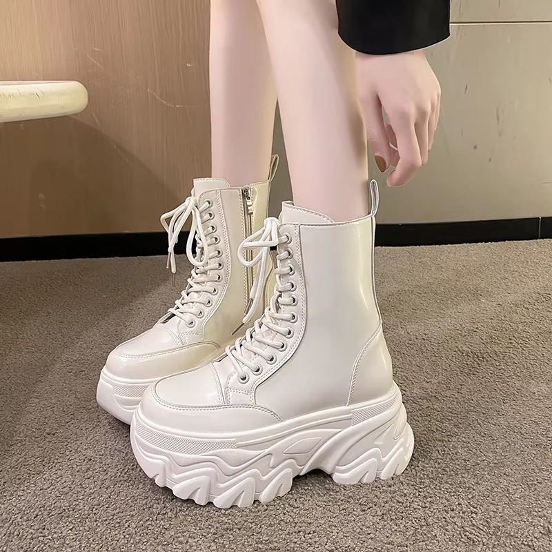 Punk Super High Platform Boots Women Chunky Heels Lace Up Motorcycle Boots Woman Black White Thick Bottom Ankle Booties Female