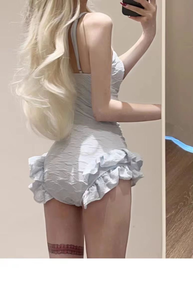 sexy Korean fashion conservative swimsuit two pieces ruched knot ruffles bodysuits bikinis with white blue mesh cover smock