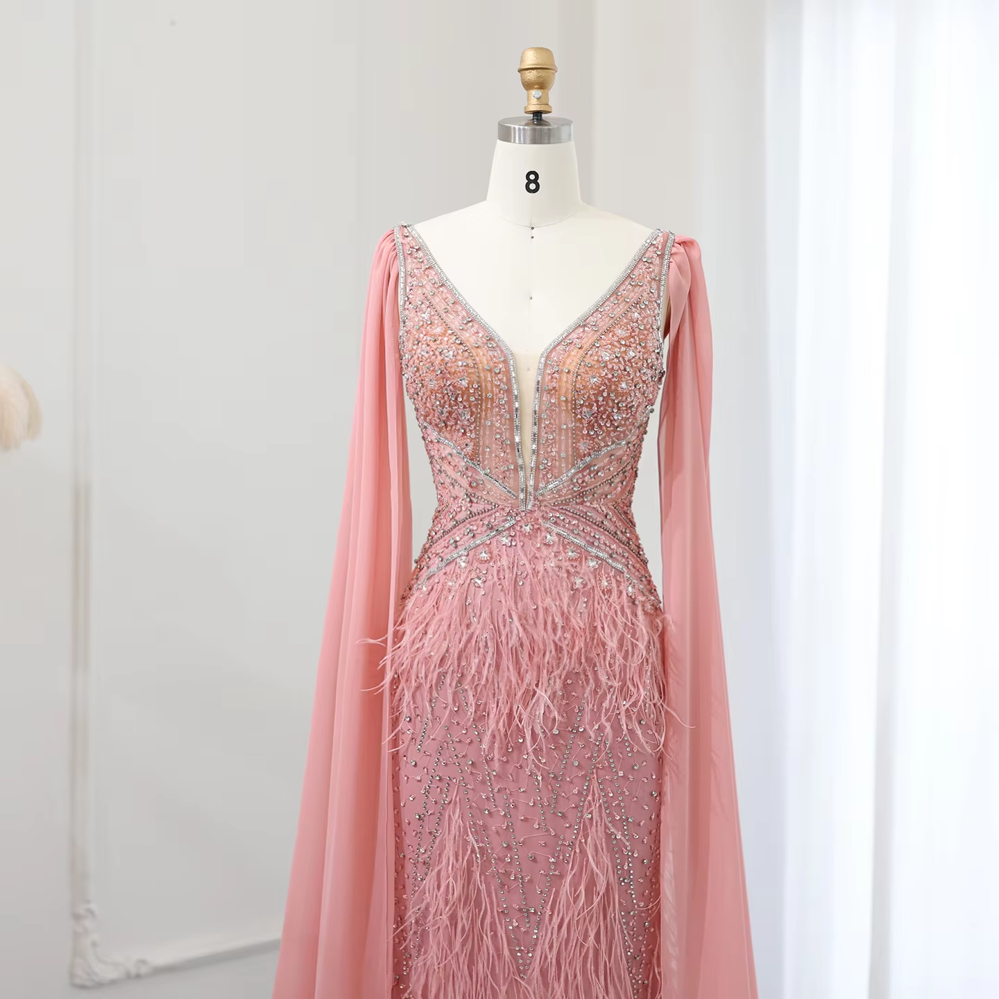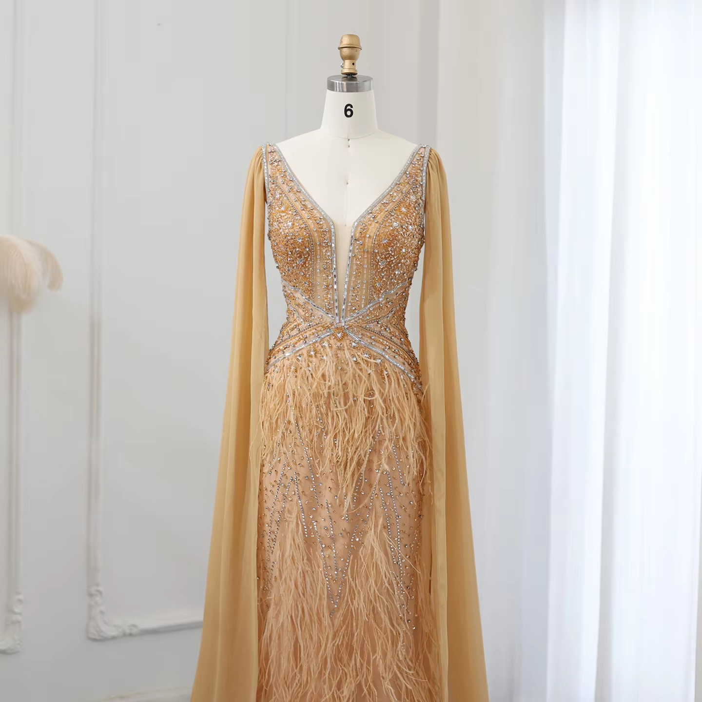 Sharon Said Luxury Feathers Blue Mermaid Evening Dress with Cape Sleeves Prom Dresses for Women Wedding Party SS027 Customized
