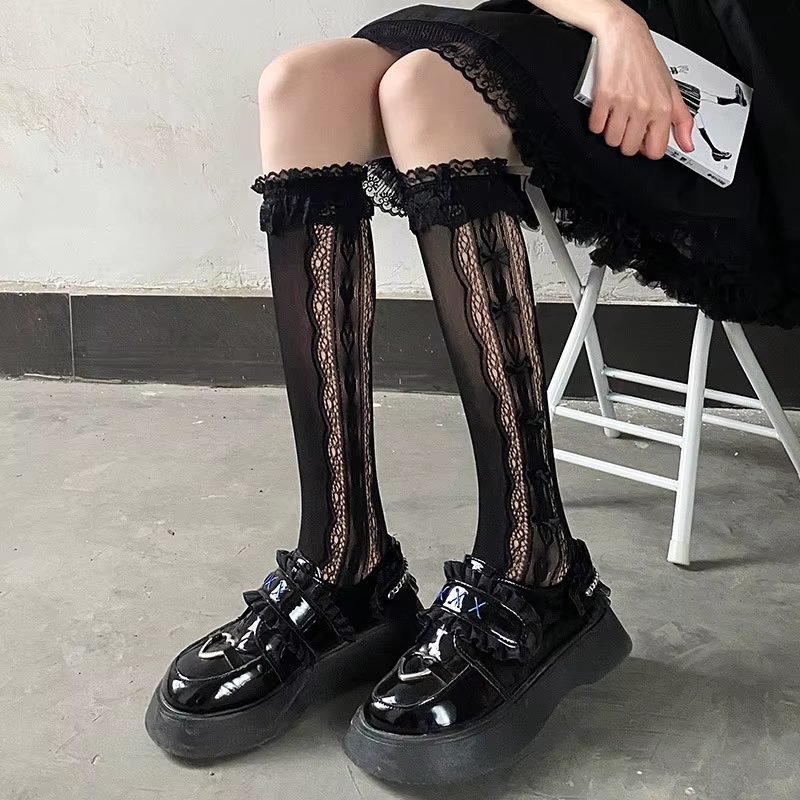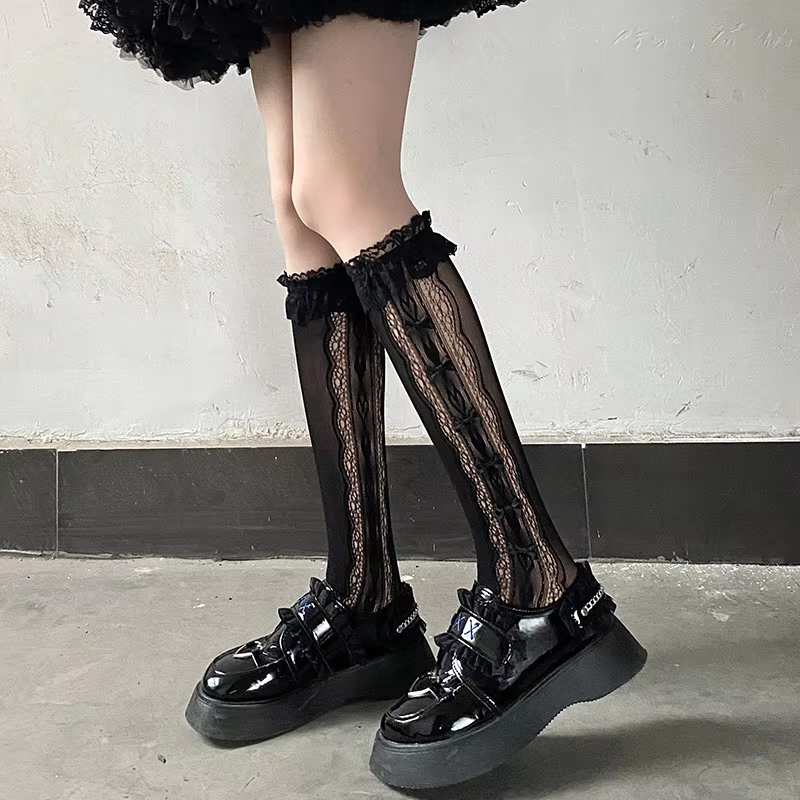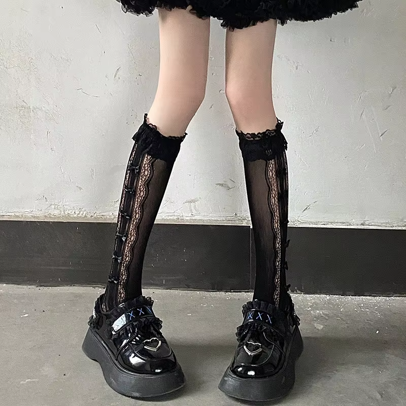 Stockings Woman Summer Thin Solid Color Bowknot Lace Middle Tube JK Lolita Cute Socks Black White Fishnet Stockings for Women