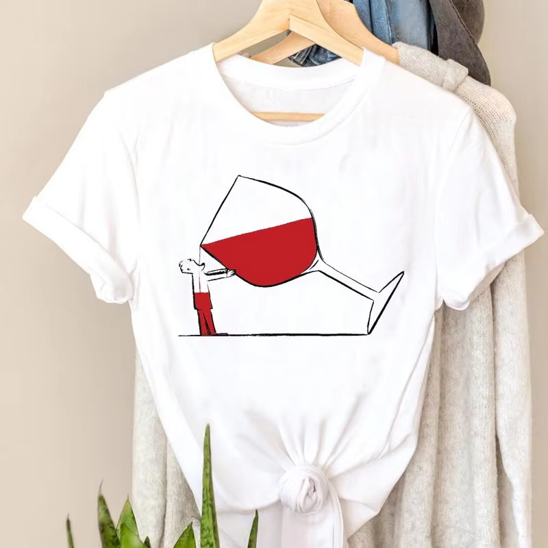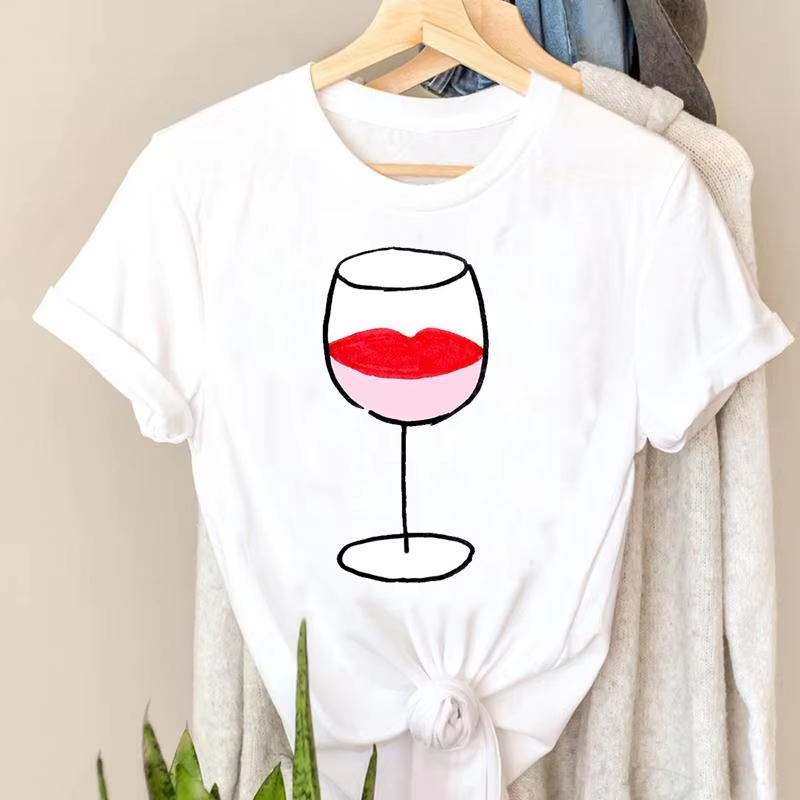 T-shirts Tee Fashion Trend Short Sleeve Women Ladies Tshirt Top Wine Style Trend Printing Lady Print Travel Graphic T-Shirt