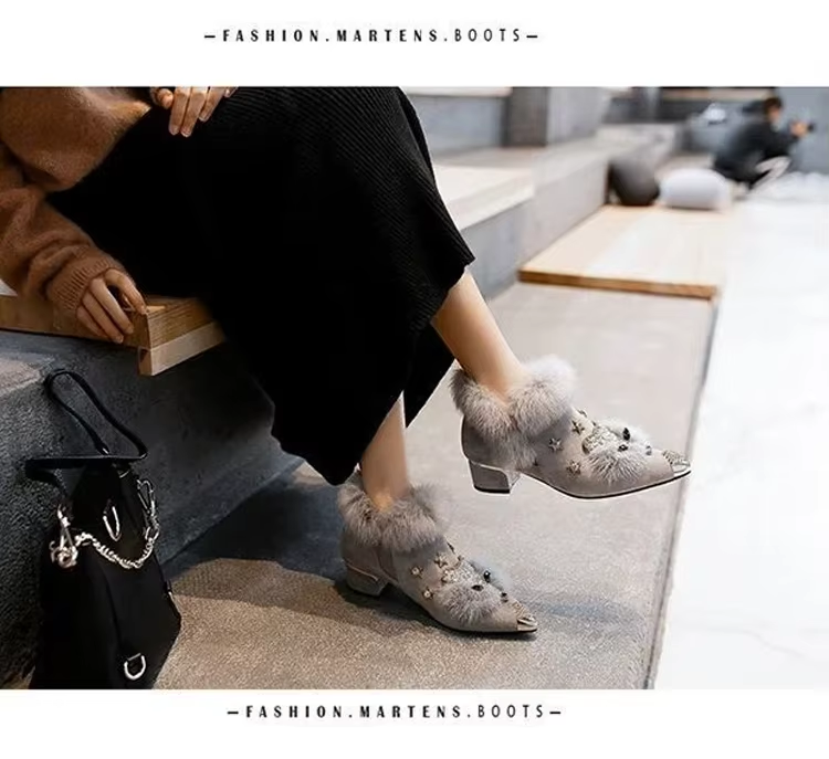 Women Ankle Boots Crystal Fox Head Women Boots 2025 Winter Fashion Metal Pointed Toe Fluffy Plush High Heel Wedding Party Shoe