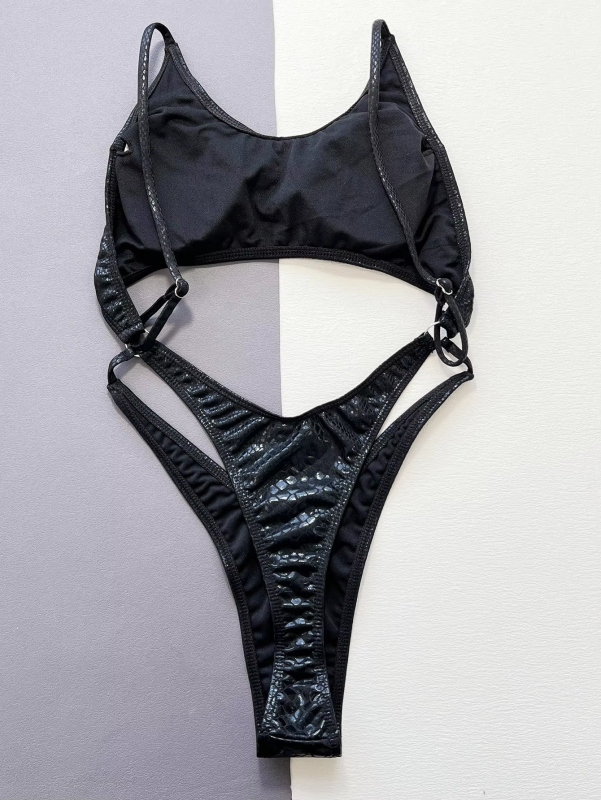 Women black snake print metallic swimsuit one piece hollow backless bikini Swimwear bathing suit beach outfits bodysuit biquini