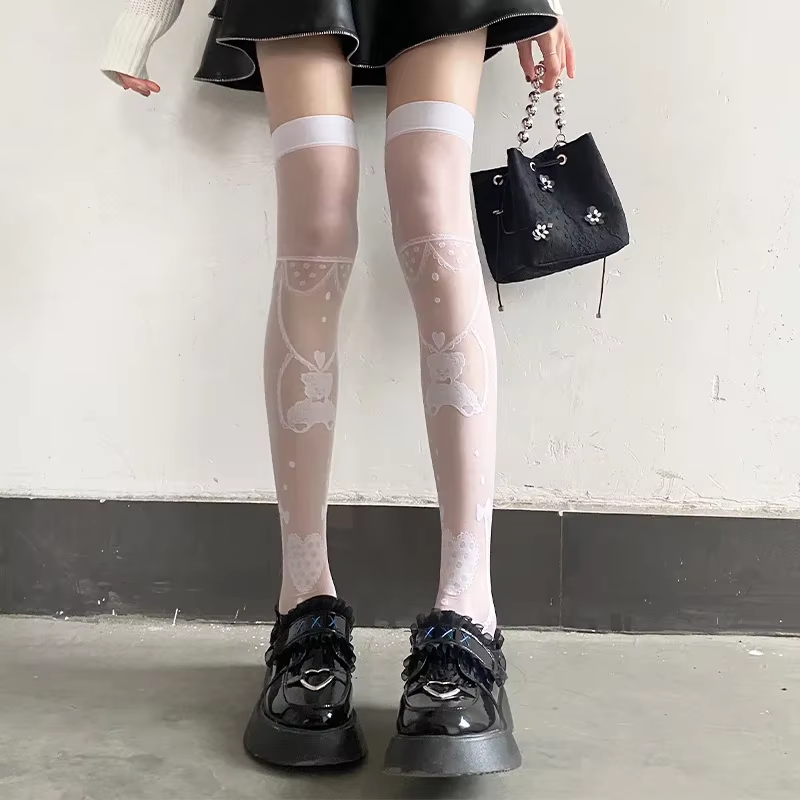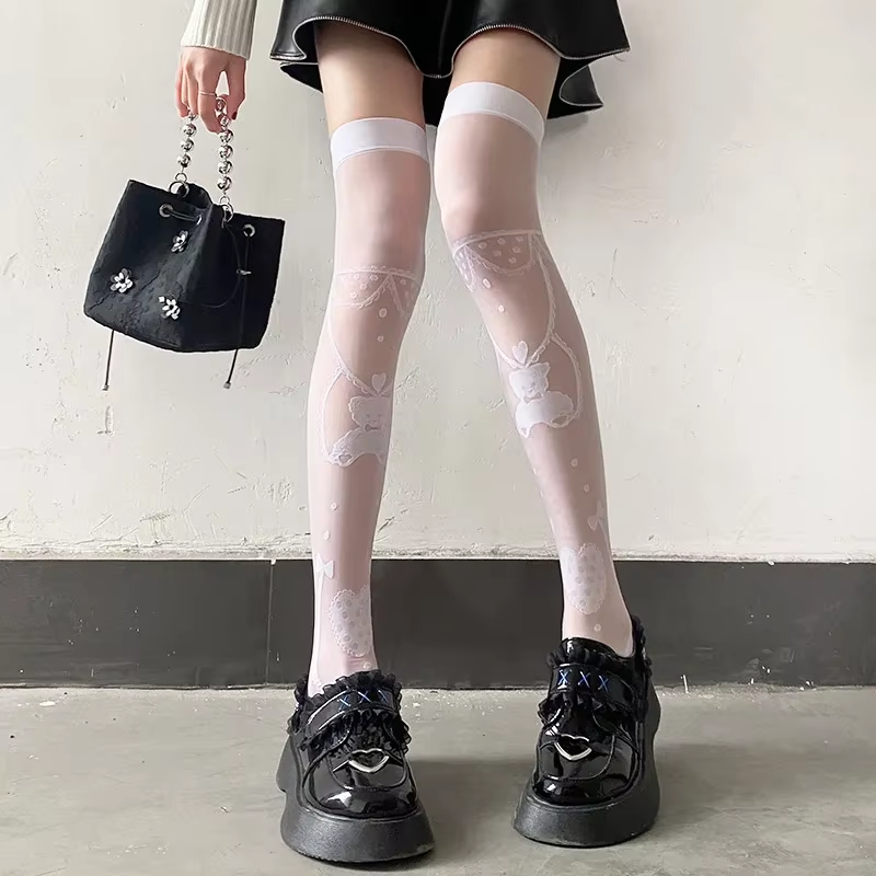 Women Love Bear Cartoon JK Lolita Thigh High Long Stockings Sexy Girls White Black Lolita Lace Party Knee Socks Lingerie Tight